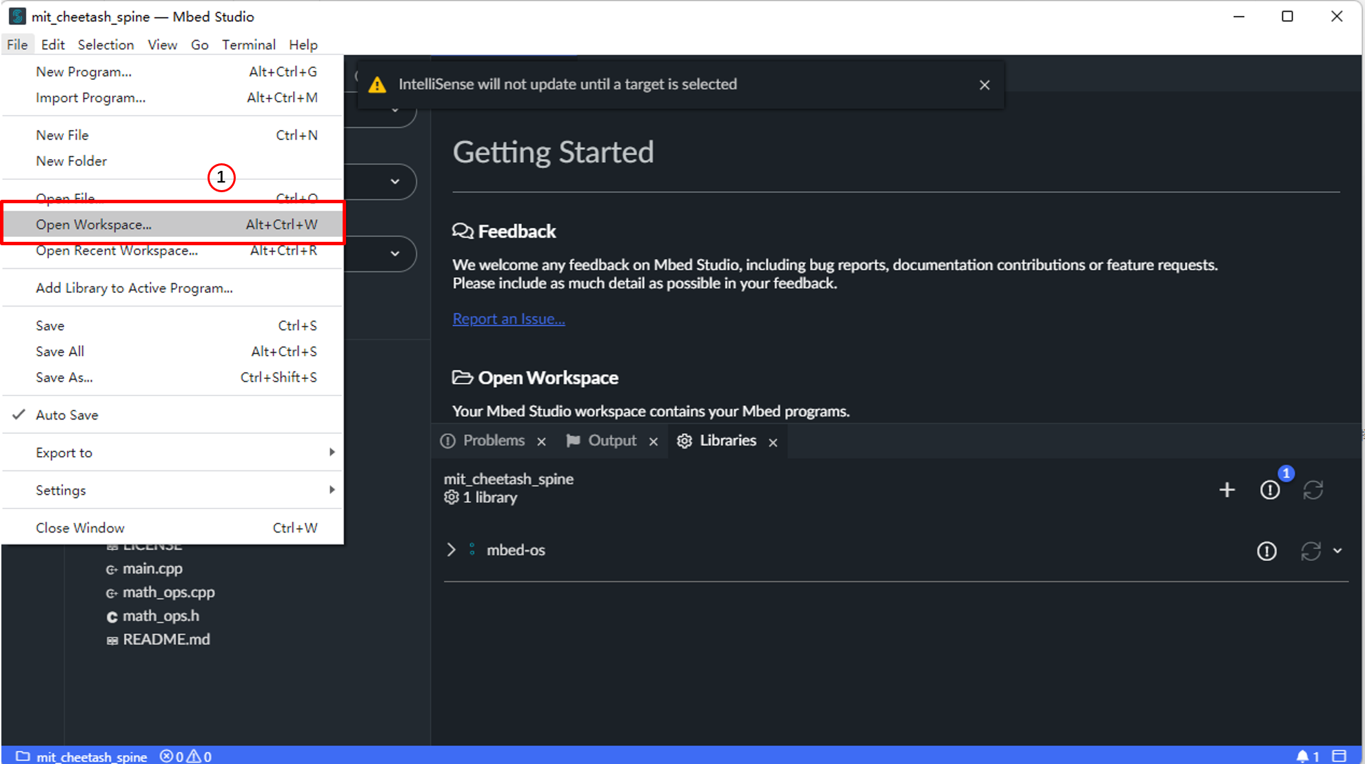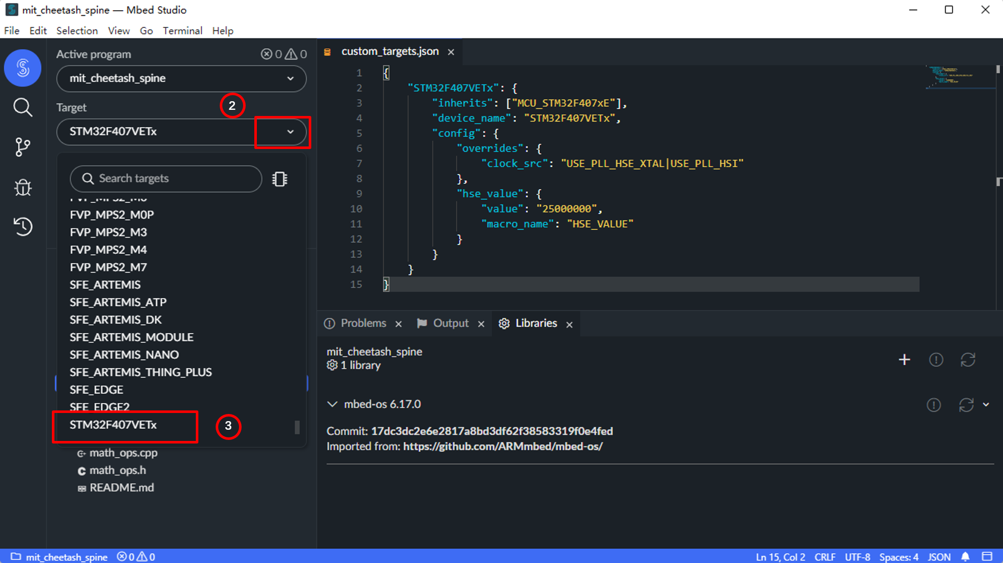 提示:注意文件目录结构不要嵌套多层mbed-os,不然会找不到targets。文件结构推荐 mit_spine_mbed_studio/mbed-os/targets。