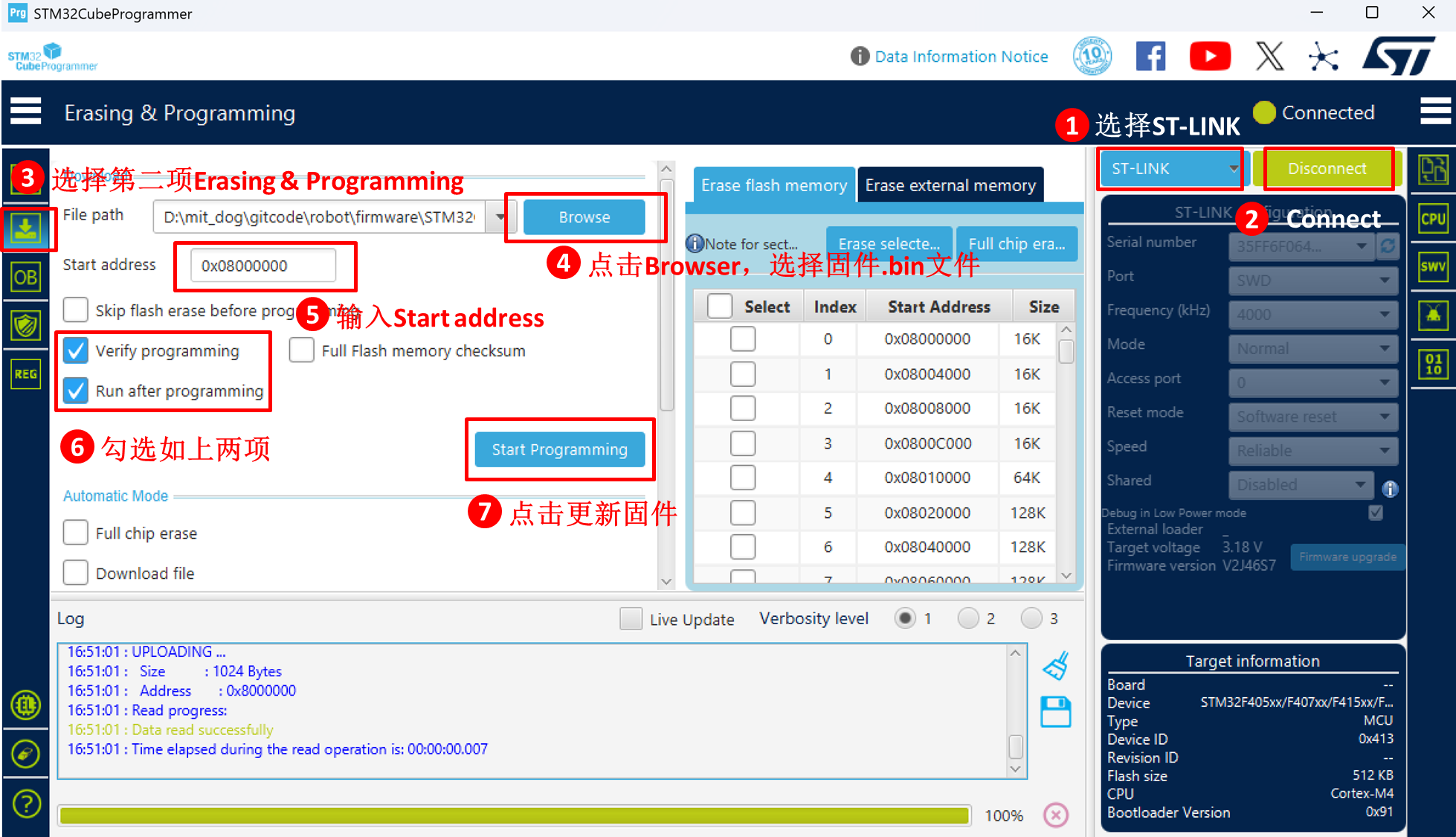 断开开发板外部电源,使用STM32CubeProgrammer将固件刷入开发板(两颗芯片需分别操作)